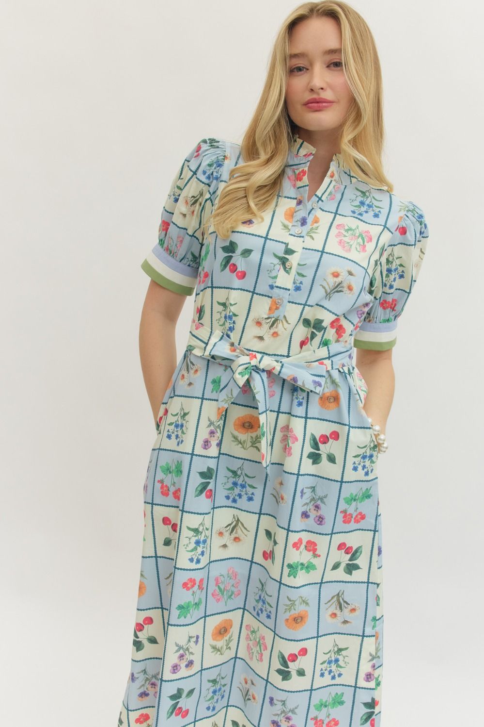 Botanical print short puff sleeve midi dress featuring ruffled accent neck band collar and self-tie belt at waist. Button closure at front. Side slit. Side pockets. Lined. Woven. Non-sheer. Lightweight.