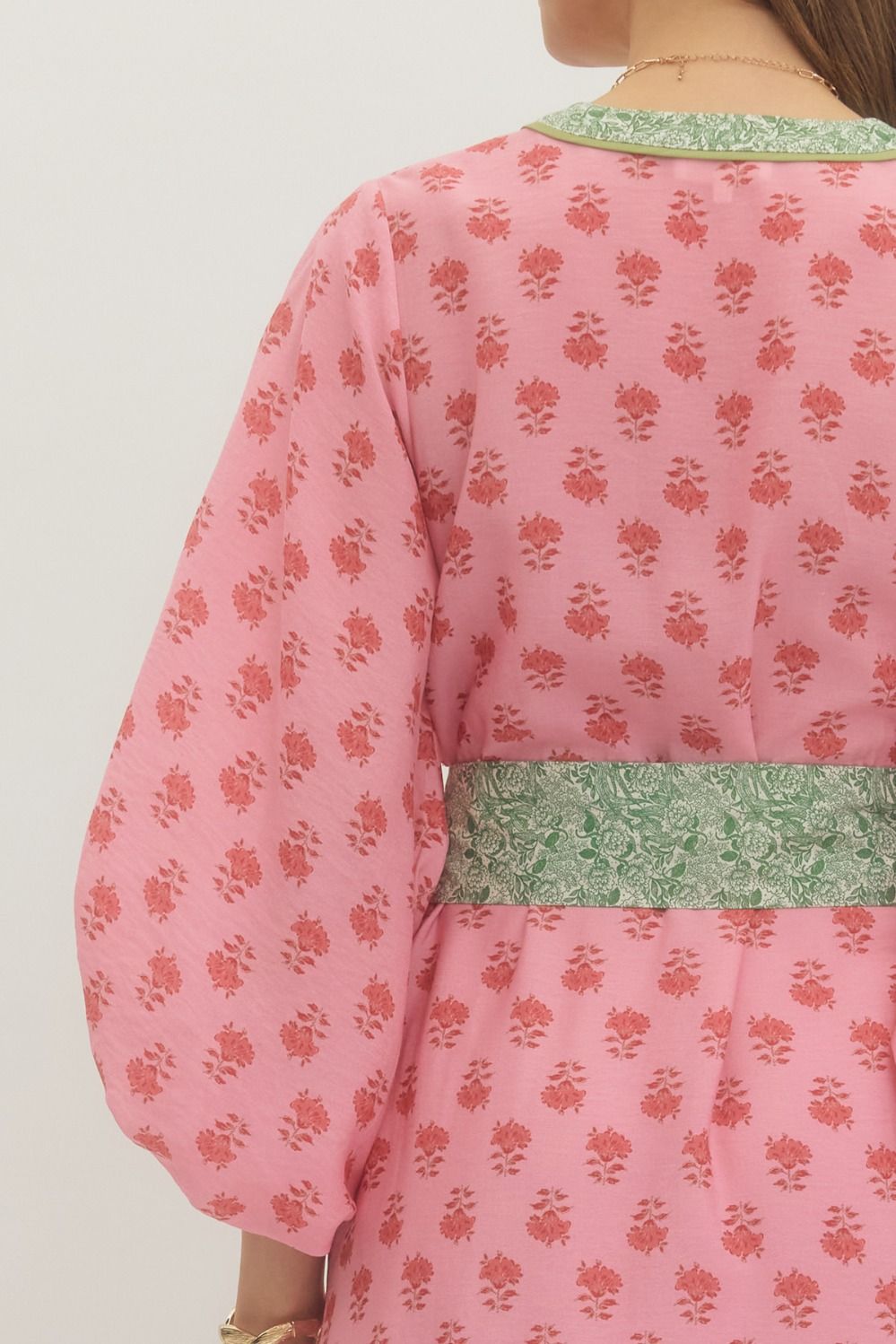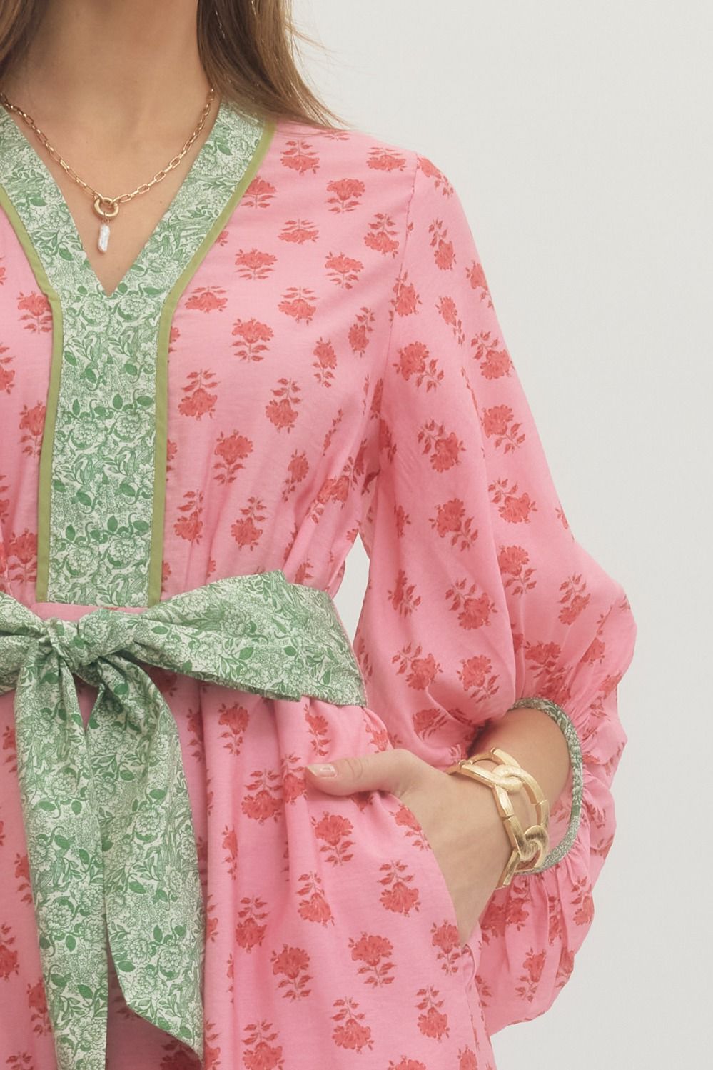 Floral Contrast Trim Midi Dress with Self-Tie Waist & Pockets