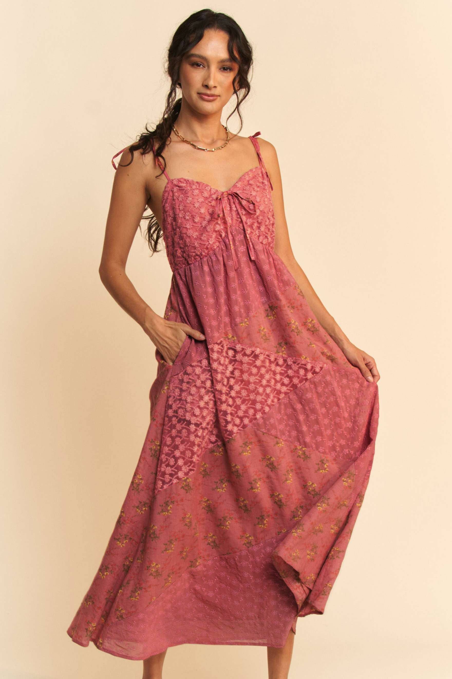 Romantic and effortlessly bohemian, the Rosewood Patchwork Maxi Dress is a dreamy blend of vintage charm and modern ease. Crafted with a mix of floral prints, lace accents, and delicate patchwork detailing, this slip-style dress features adjustable tie straps and a flattering empire waistline. The flowy silhouette and soft pink tones make it perfect for summer picnics, wine nights, or barefoot strolls in the garden.