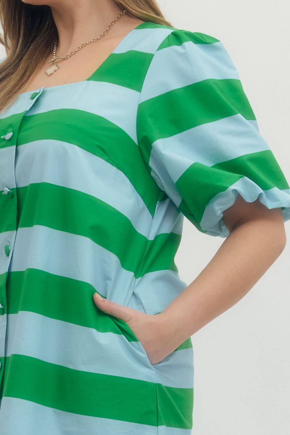 Green and light blue bold stripe short puff sleeve mini dress featuring button closure at front and side pockets. Lined. Woven. Non-sheer. Lightweight.