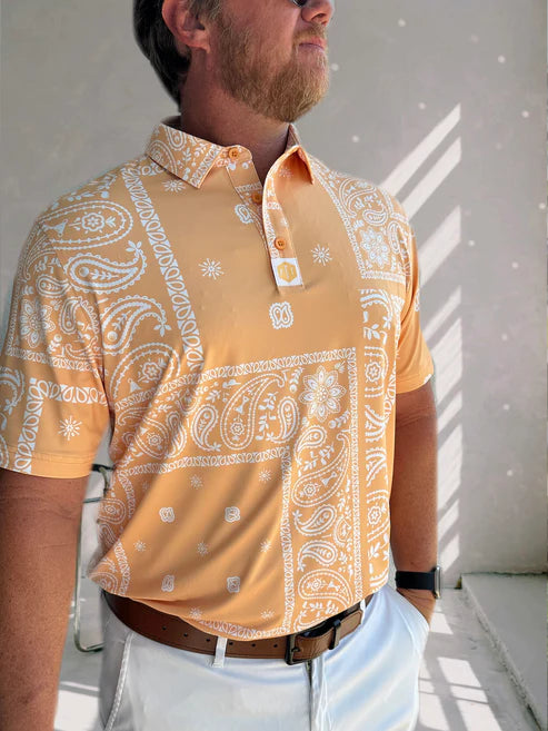 The Hidden Hanky Polo brings a fun twist to classic style with its sleek bandana pattern infused with subtle golf-inspired details. Designed for those who love the game and its culture, this playful polo blends timeless fashion with a wink to your favorite sport. Whether you're on the greens or out with friends, it’s a clever way to show your passion in a stylish, unexpected way. Comfortable and eye-catching, it’s perfect for golfers who like to keep their love of the game delightfully under wraps