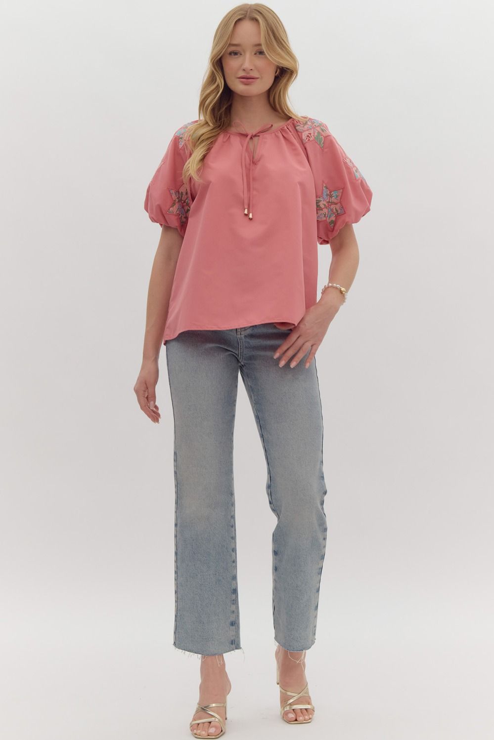 Solid v-neck bubble sleeve top featuring patch embroidery at sleeves. Self tie at neck. Elastic at cuff. Unlined. Woven. Non-sheer. Lightweight.