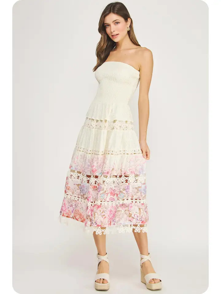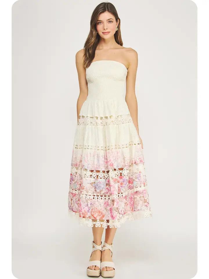 Eyelet tube strapless midi dress in border floral print on embroidered eyelet cotton blend fabric. This style features smocked tube bodice, midi length, scalloped crochet lace trim at hem/skirt, and half lining for comfort.