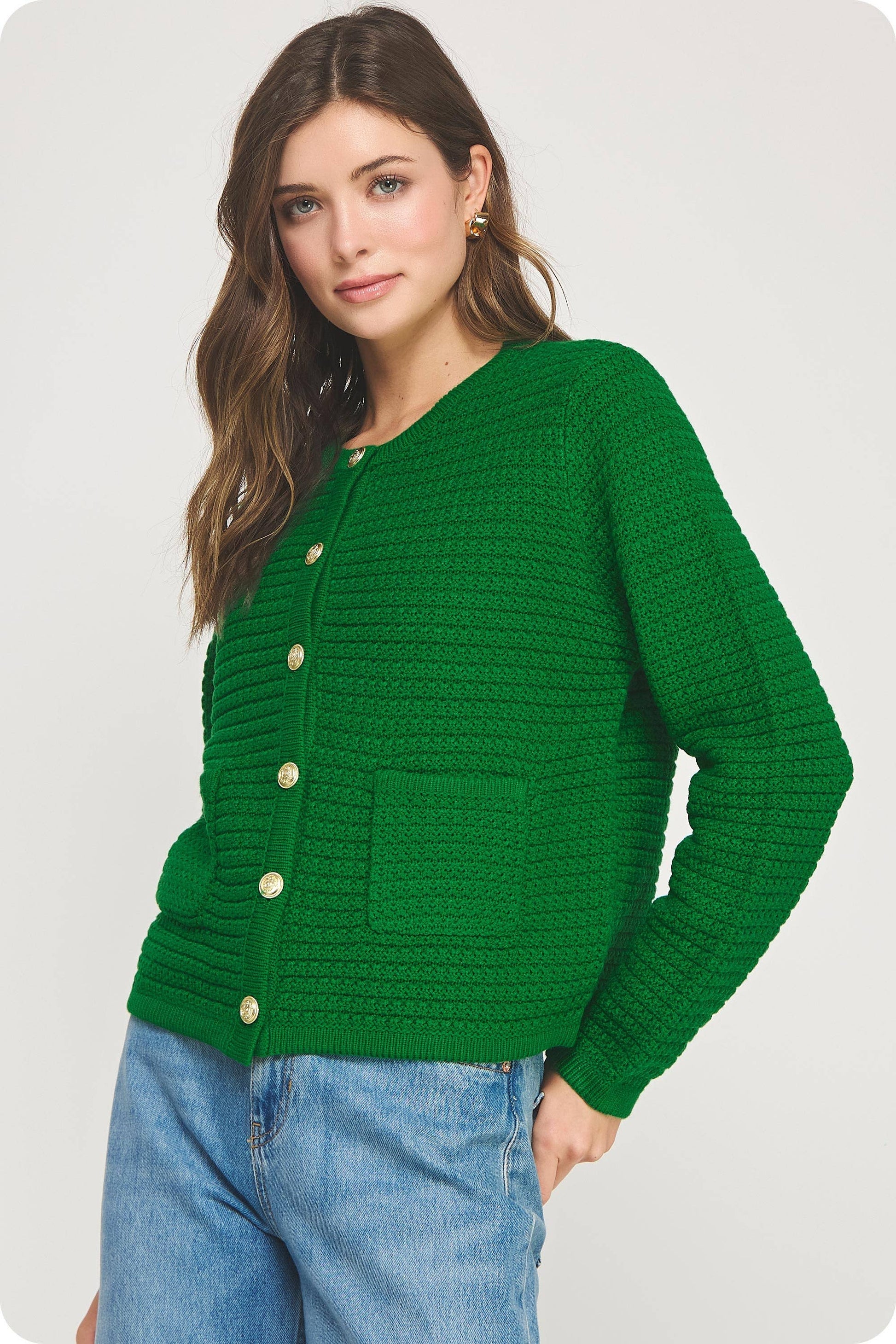 Studio Strut and Bolt Collection. Button down cardigan jacket sweater in texture knit fabric. This chic versatile knitted style features gold button closure at front, front pockets, round neckline, and long sleeves.